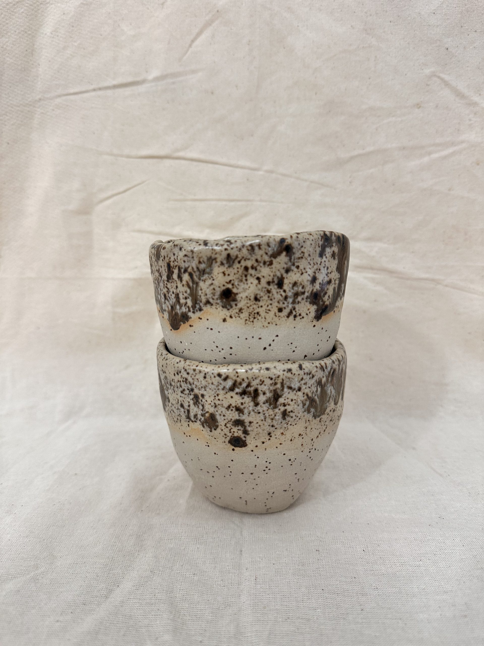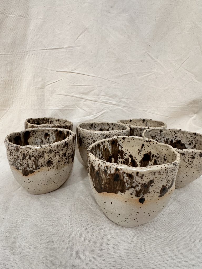 Taza tamaño Latte sin asa, barro de alta temperatura con puntitos y acabado marrón con manchas